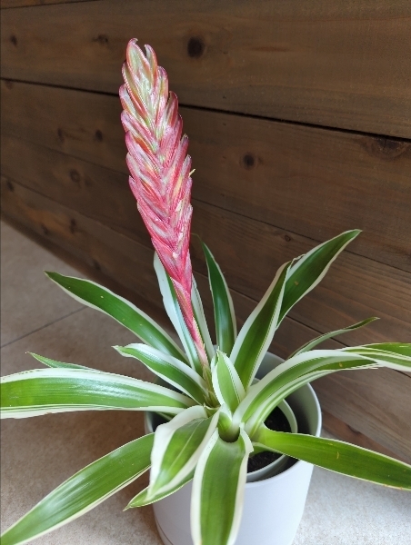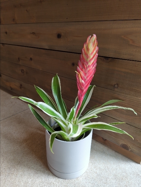 竹豊園オリジナル品種で、フリーセア・レッドキングの突然変異朱として誕生したオオインコアナナスです。明るい日差しを好み、比較的育てやすい植物です。成長が早く、鮮やかな斑入りの葉が特徴で、エキゾチックな雰囲気を醸し出します。